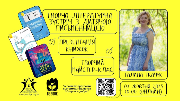 Вже 03 жовтня (п’ятниця) о 10:00, в онлайн-форматі, відбудеться творчо-літературна зустріч з дитячою письменницею Галиною Ткачук з авторською презентацією книжок і тематичним майстер-класом – https://meet.google.com/kes-vvmj-epk 🥳